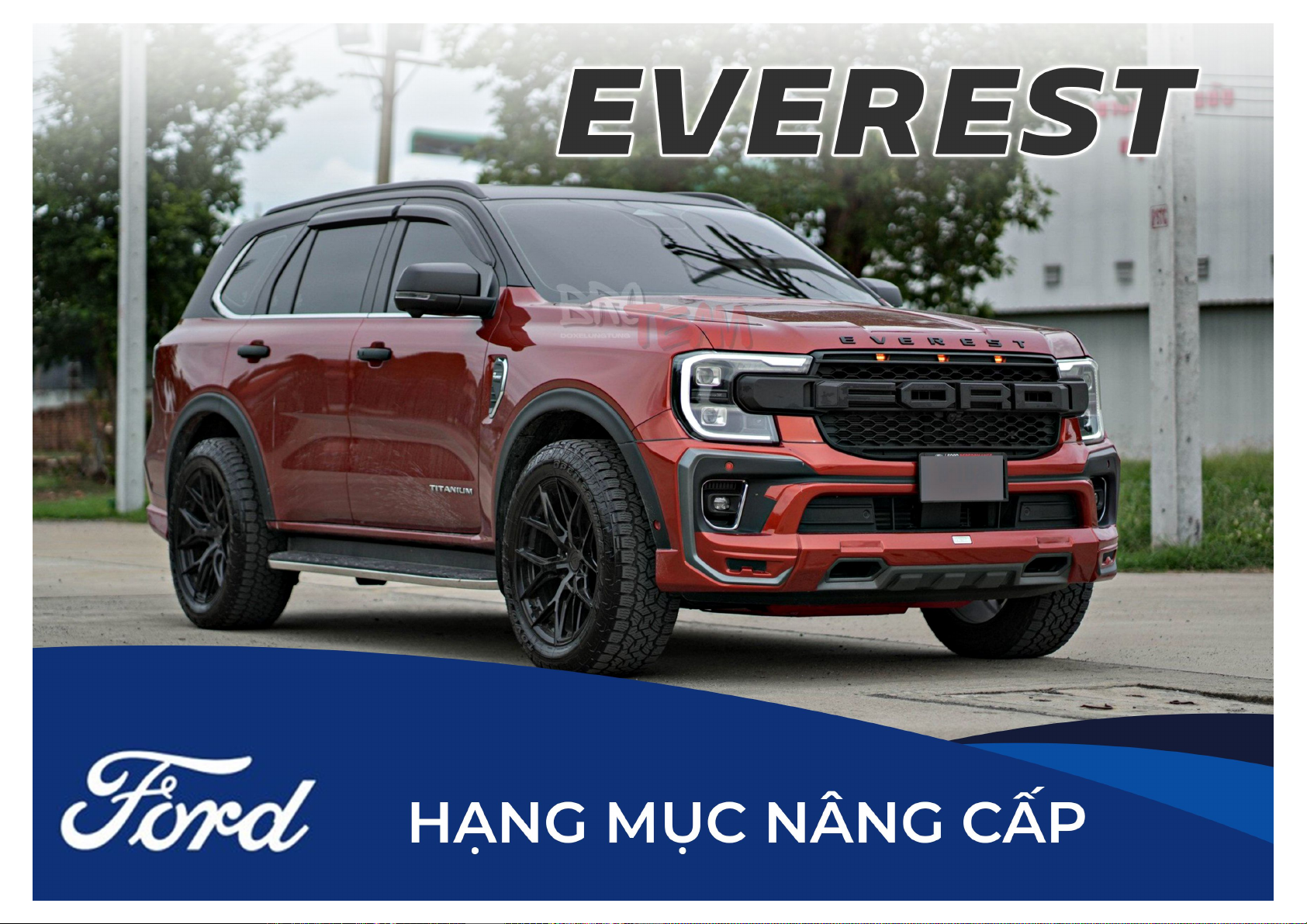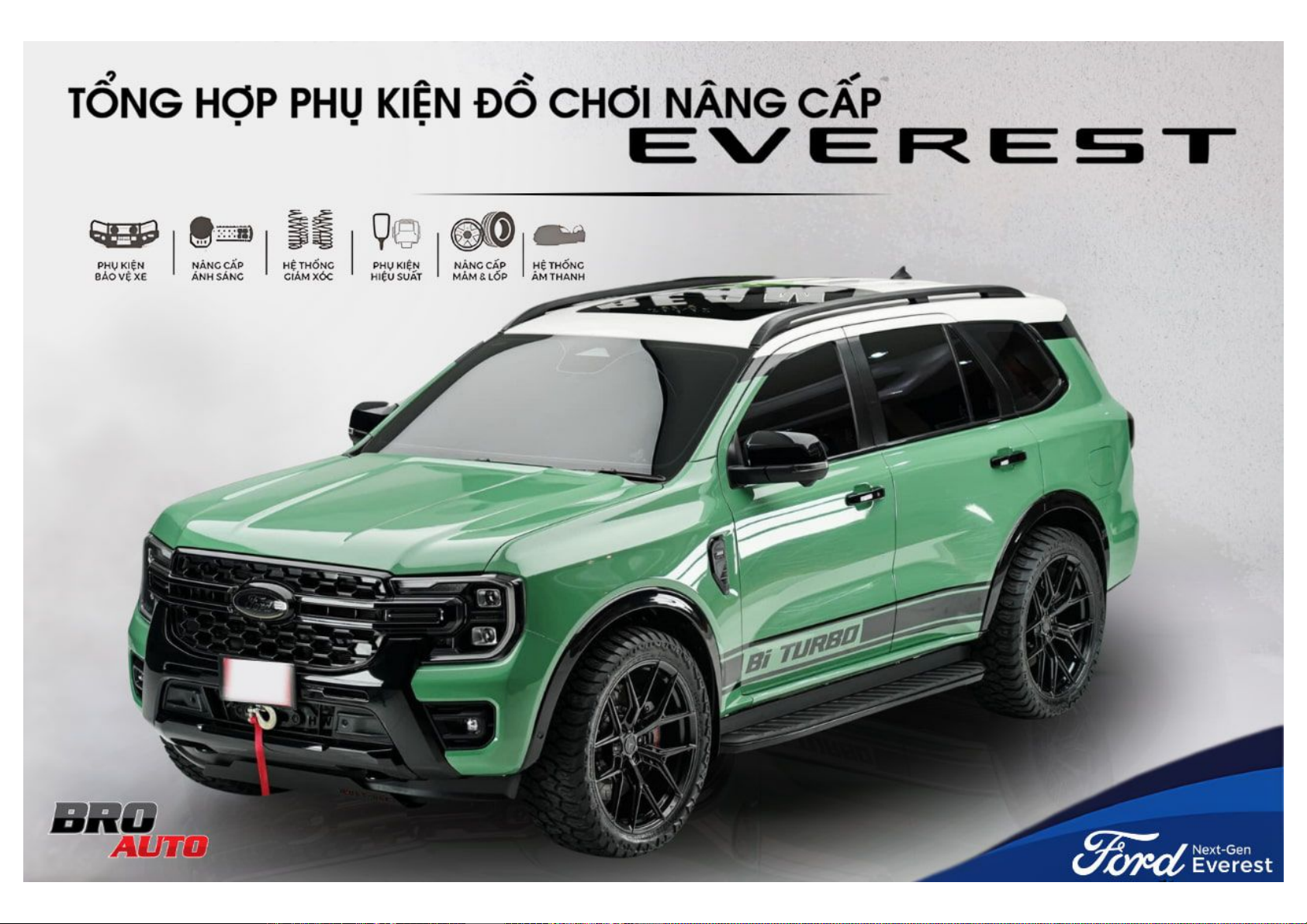 Tài liệu cung cấp phụ kiện nâng cấp xe Ford Everest: bảo vệ, ánh sáng, giảm xóc, hiệu suất, mâm lốp, âm thanh, body kit Victor V1/V2, Raptor, baga mui, phủ ceramic, PPF, cách âm.