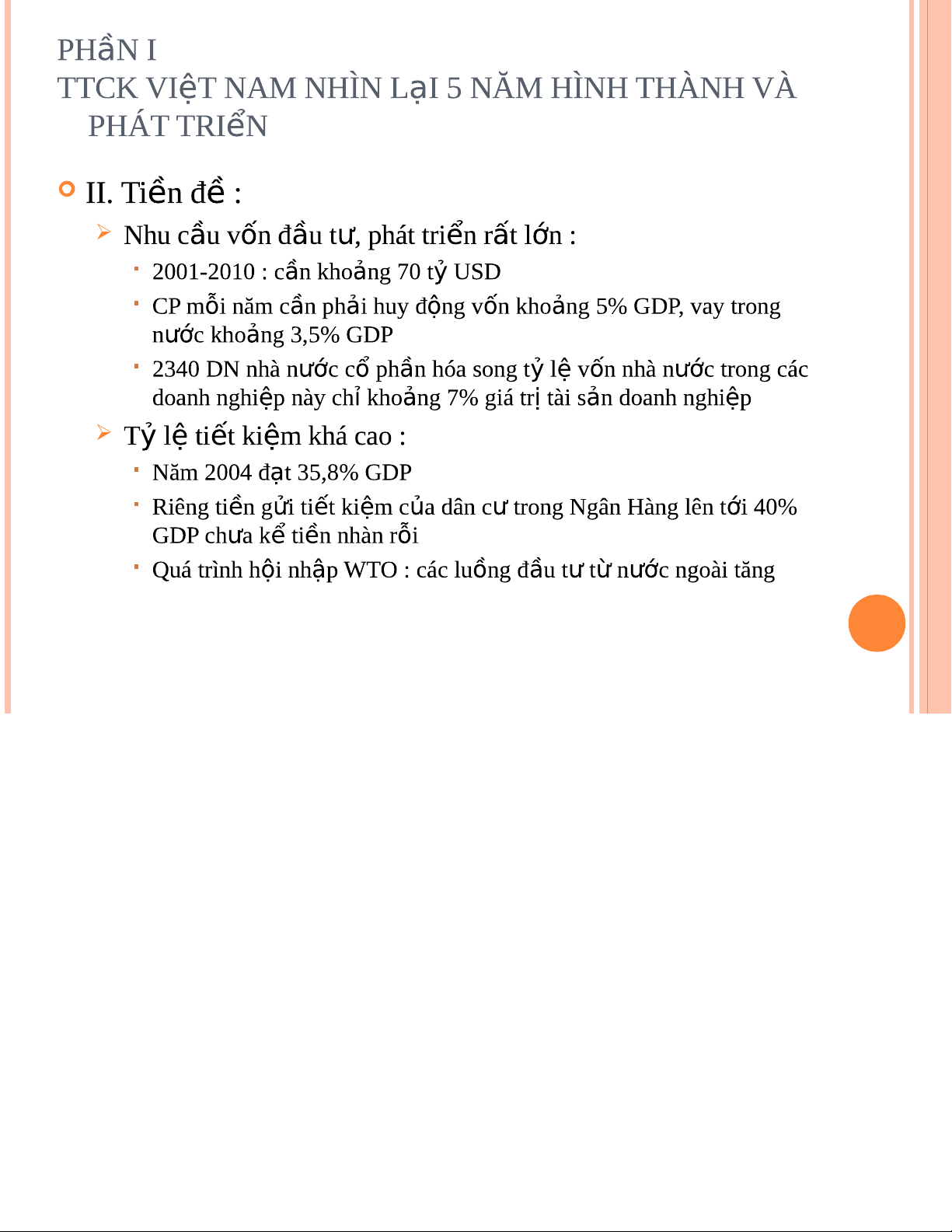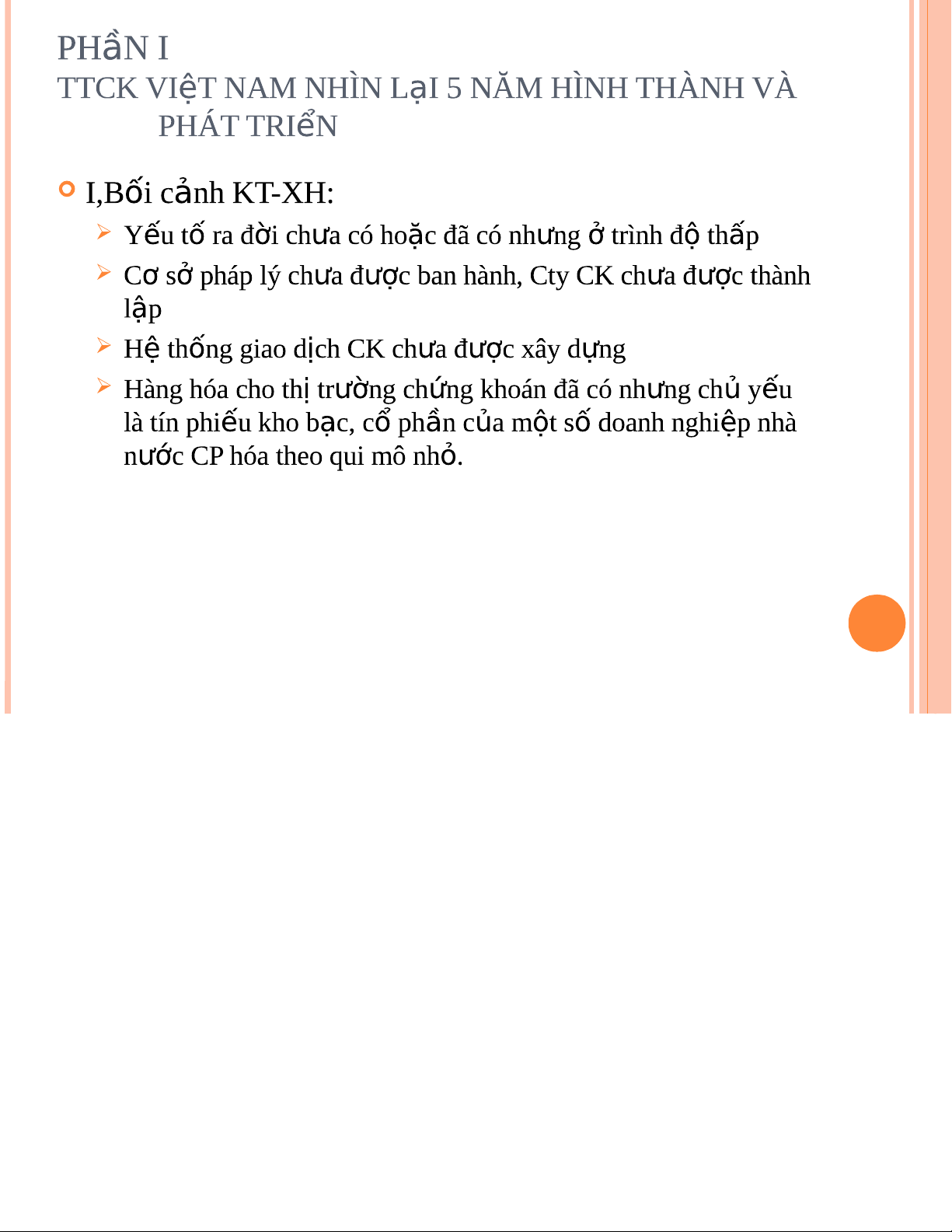Yếu tố ra đời chưa có hoặc đã có nhưng trình độ thấp, cơ sở pháp lý chứ được ban hành, công ty chứng khoán chưa được thành lập. Hệ thống giao dịch chứng khoán chưa được xây dựng. Hàng hóa cho thị trường chứng khóa đã có những tín phiếu kho bạc, cổ phần của một số doanh nghiệp nhà nước cổ phần hóa theo qui mô nhỏ