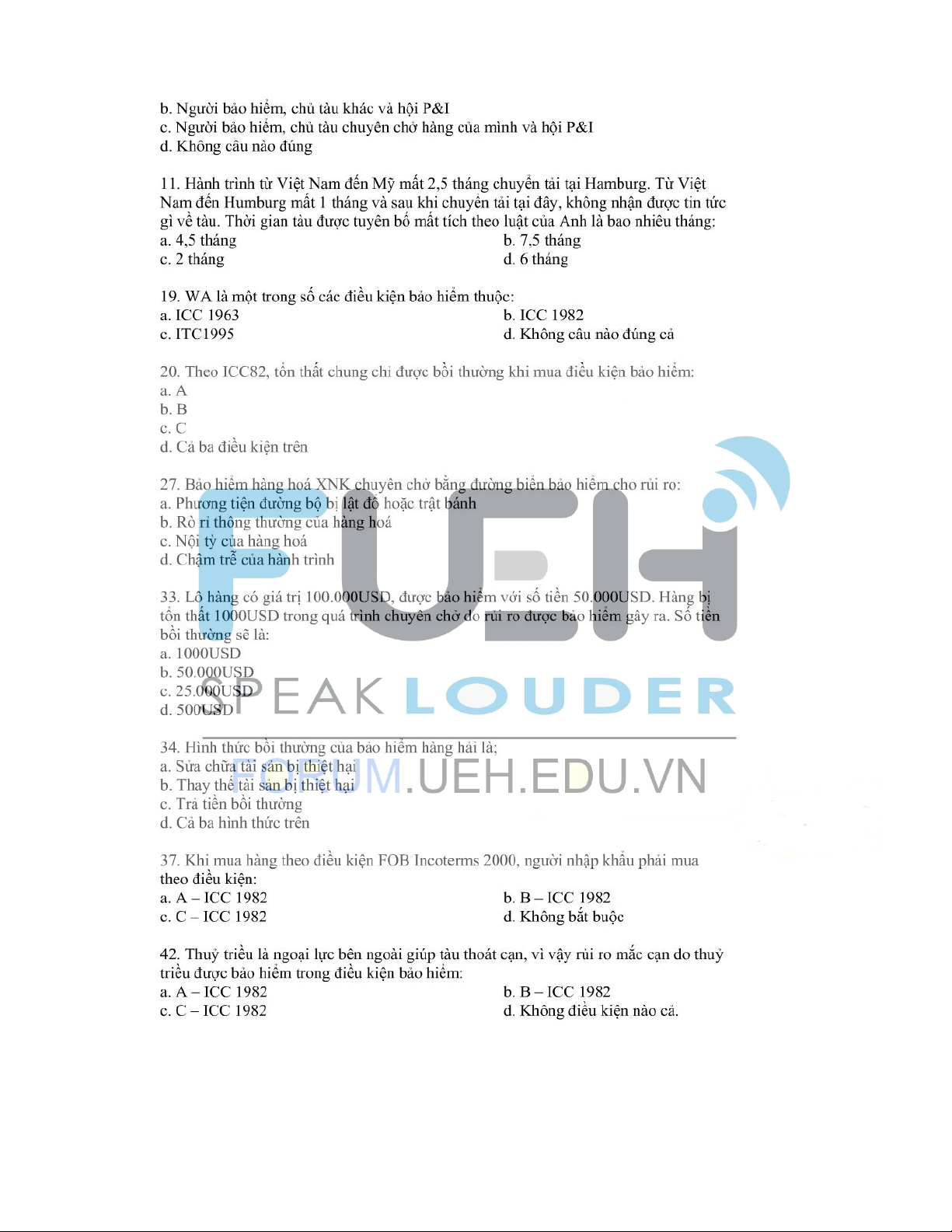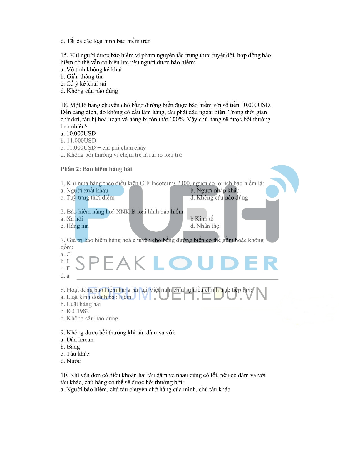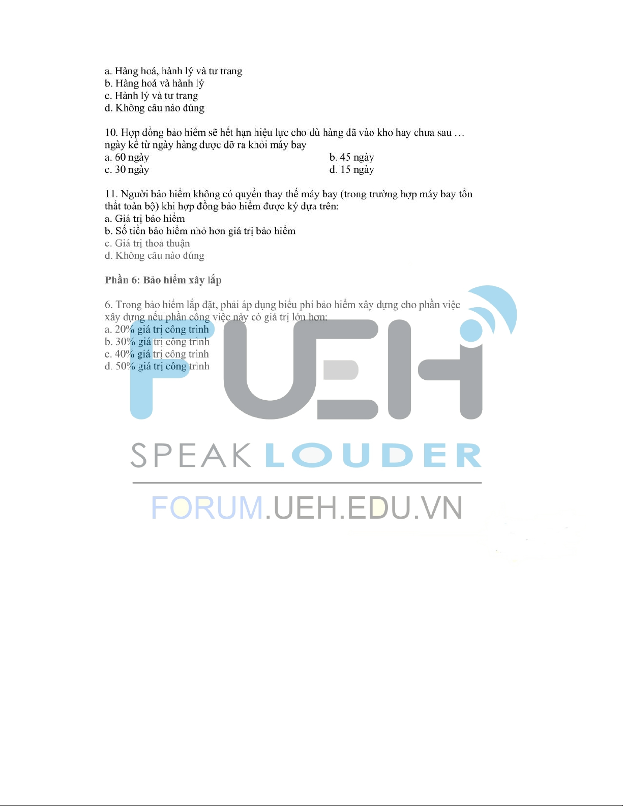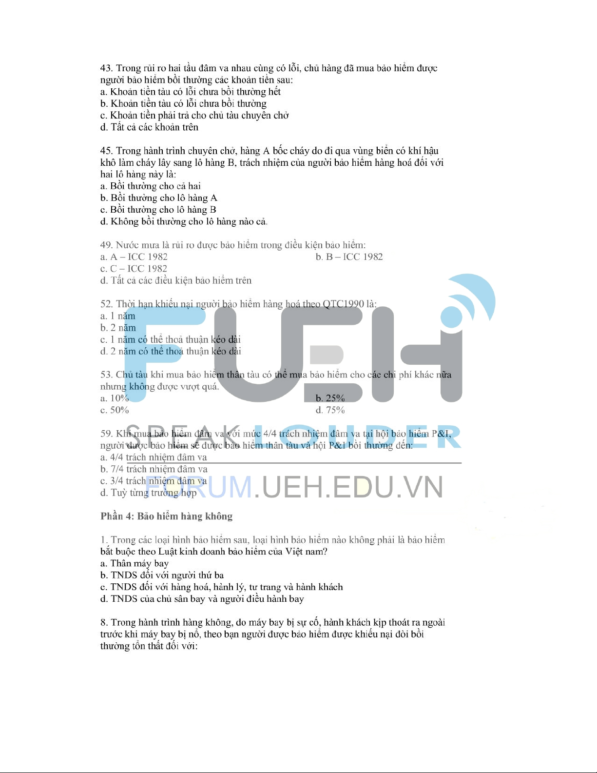 Tài liệu tổng hợp các câu hỏi trắc nghiệm bảo hiểm trong kinh doanh dưới đây có cấu trúc phân chia câu hỏi gồm các phần sau: Phần 1 Khái quát chung về bảo hiểm, phần 2 bảo hiểm hàng hải, phần 3 bảo hiểm hàng không, phần 4 bảo hiểm xây lắp.