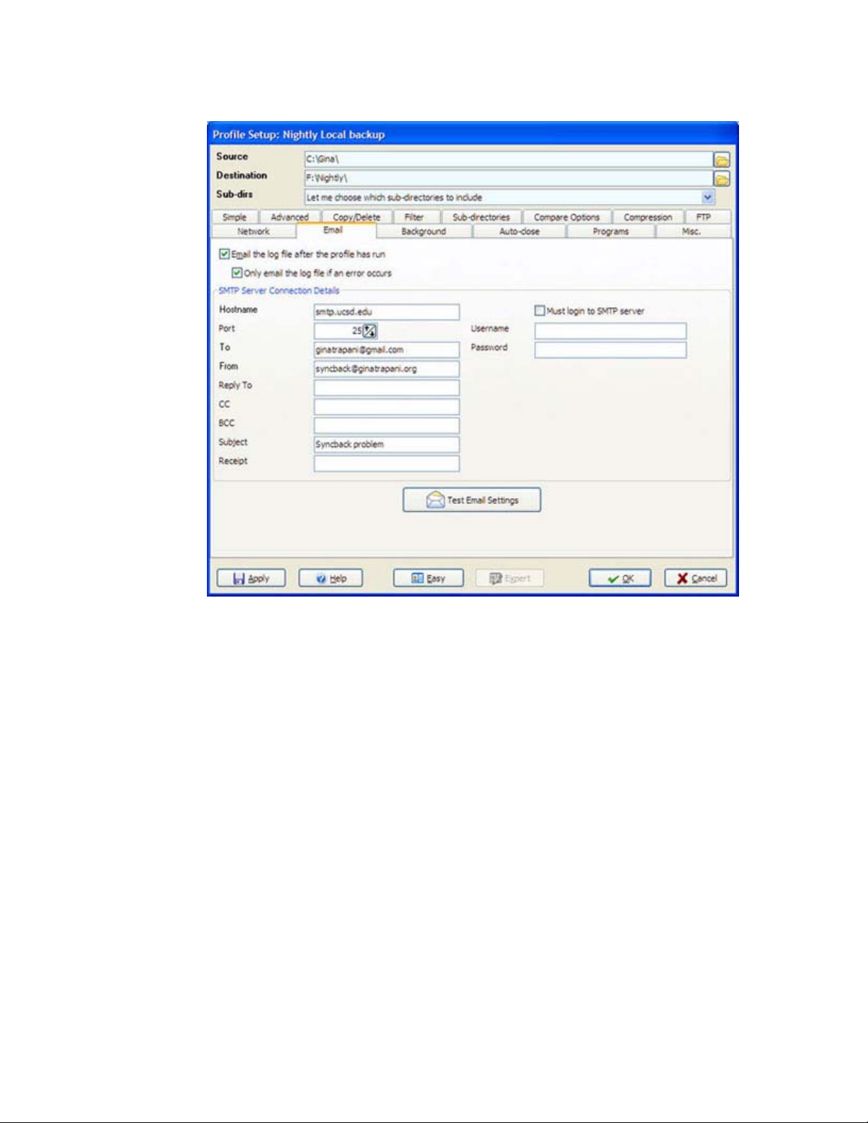 của FTP server. Tạo SyncBack profile cuối cùng có tên "Nightly Remote Backup" để gửi