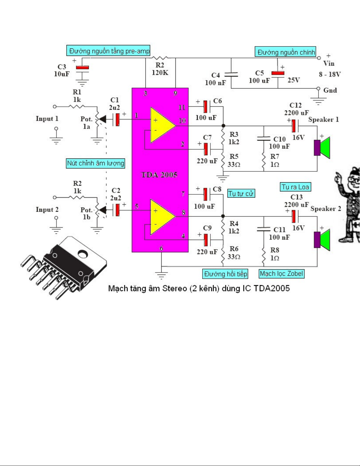 IC TDA2005 có th làm vi c v i m c ngu n DC trên chân s 9, ngu n DC t 8V đ n 18V. Chúng ta bi tể ệ ớ ứ ồ ố ồ ừ ế ế