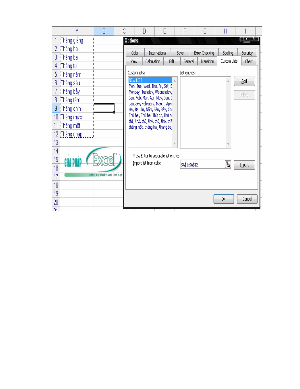 Excel trước 2007, Tools ➝ ➝ Options Custom Lists), trong vùng Import List in cells,