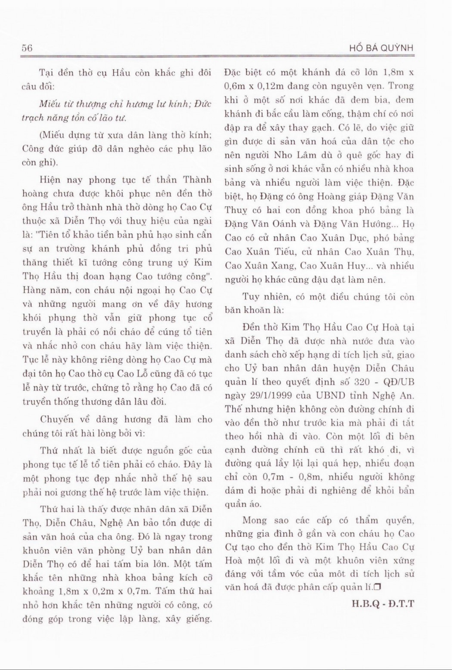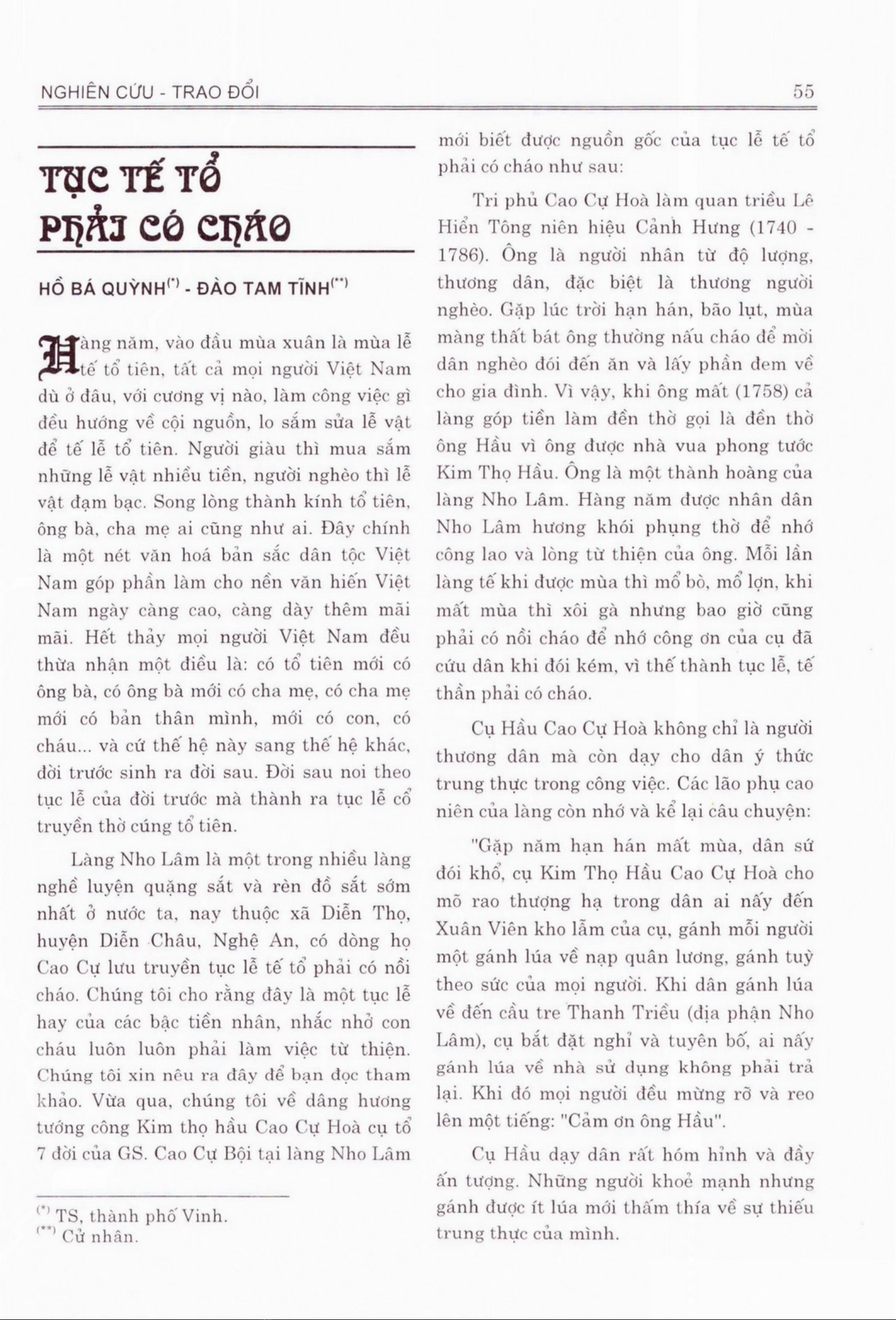 Tài liệu khám phá tục lệ tục tế tổ phải có cháo của dòng họ Cao Cự tại làng Nho Lâm, Diễn Thọ, Nghệ An. Phong tục này được quan tâm khi con cháu phát triển và giữ gìn các giá trị văn hóa truyền thống. Bài viết cho thấy tục lệ này không chỉ là một nghi lễ mà còn là một cách để con cháu nhớ ơn các bậc tiền nhân. Vai trò của phong tục này trong đời sống tinh thần của người Việt đã được thấy qua việc gắn kết giữa các thế hệ. Cách thức thực hiện tục lệ này bao gồm việc sử dụng một nồi cháo, để con cháu luôn luôn phải làm việc từ thiện. Phong tục này còn khuyên cho các bậc tiền nhân rèn luyện kĩ năng và trí tuệ để quản lý xã hội.
