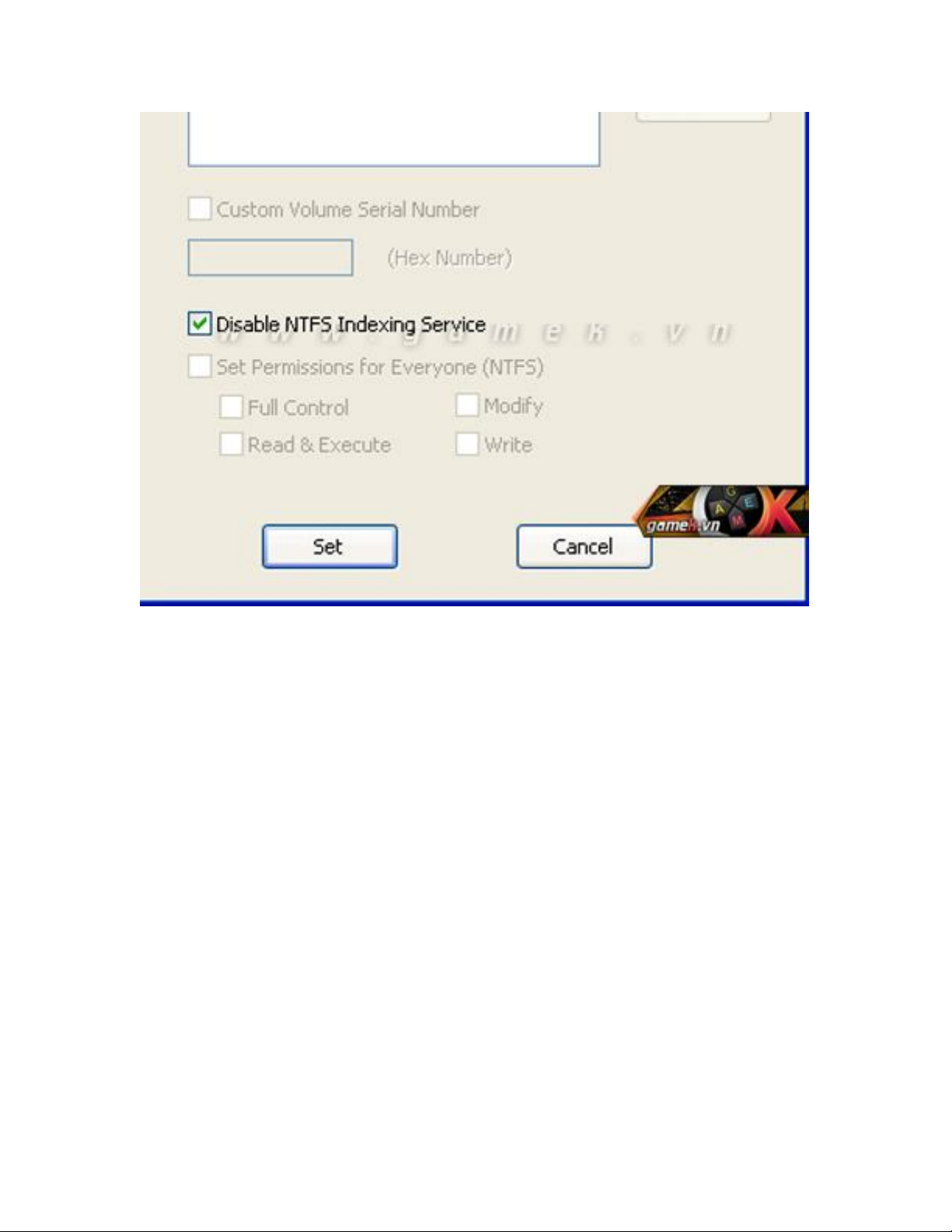 - More: đánh dấu chọn Disable NTFS Indexing