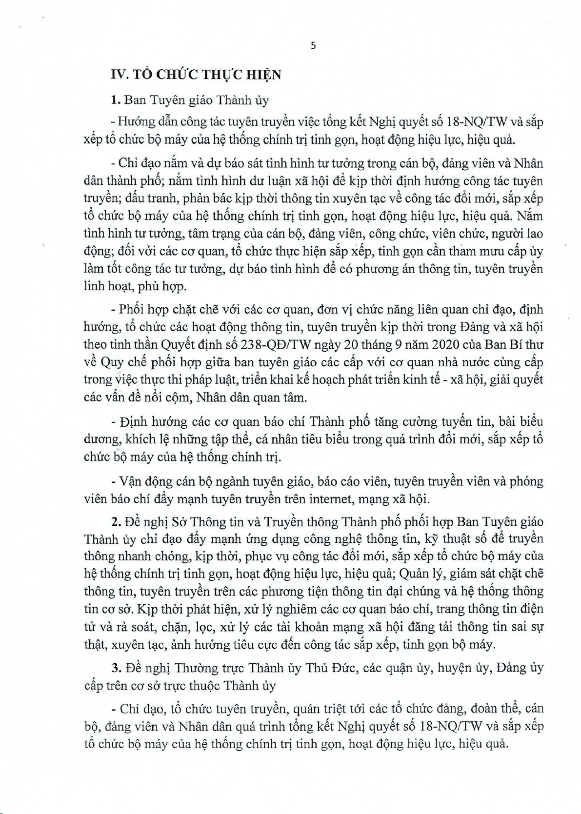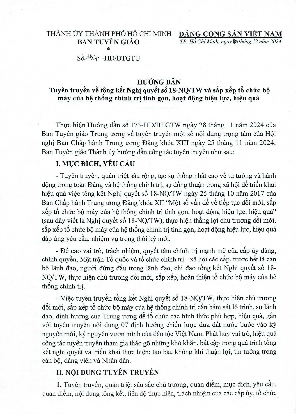 Văn bản hướng dẫn số 137-HD/BTGTU về việc hướng dẫn tuyên truyền về tổng kết Nghị quyết số 18-NQ/TW và sắp xếp tổ chức bộ máy của hệ thống chính trị tinh gọn, hoạt động hiệu lực, hiệu quả.