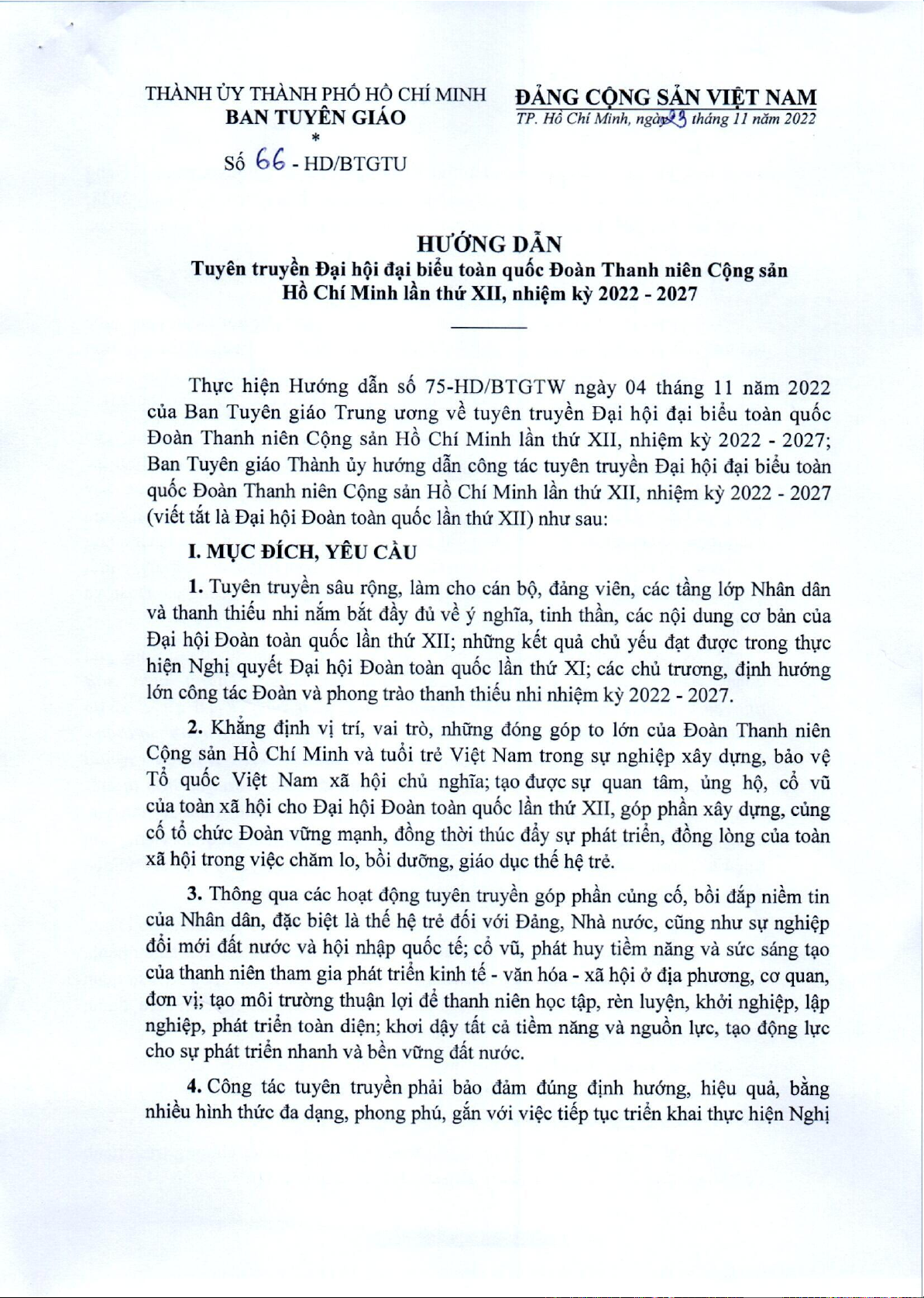Công văn này là Hướng dẫn của Ban Tuyên giáo Thành ủy Thành phố Hồ Chí Minh về việc tuyên truyền Đại hội đại biểu toàn quốc Đoàn Thanh niên Cộng sản Hồ Chí Minh lần thứ XII, nhiệm kỳ 2022 - 2027. Hướng dẫn được ban hành vào ngày 03 tháng 11 năm 2022, với mục đích và yêu cầu cụ thể đối với công tác tuyên truyền.