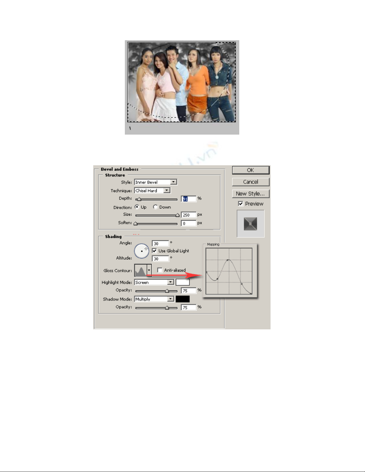 Sau đó vào Layer > layer Style > Bevel and Emboss