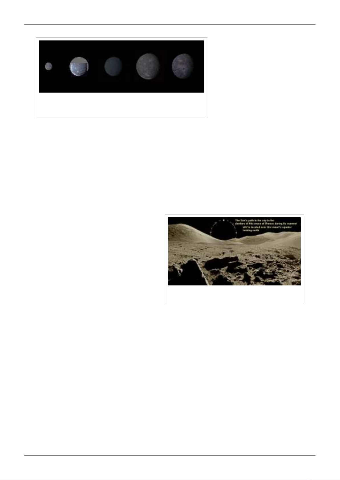 Sao Thiên Vương và sáu vệ tinh lớn nhất của nó. Từ trái sáng phải: Puck, Miranda,