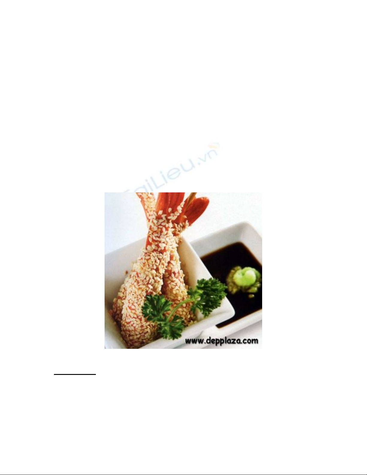 300g tôm tươi, vừng, 100ml rượu trắng, mù-tạt xanh Wasabi, nước tương đậu