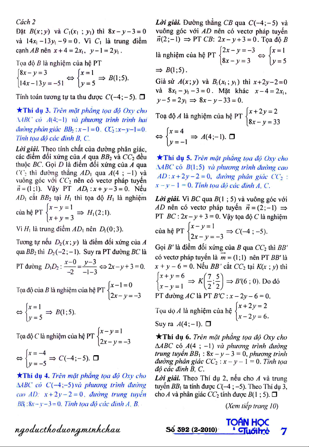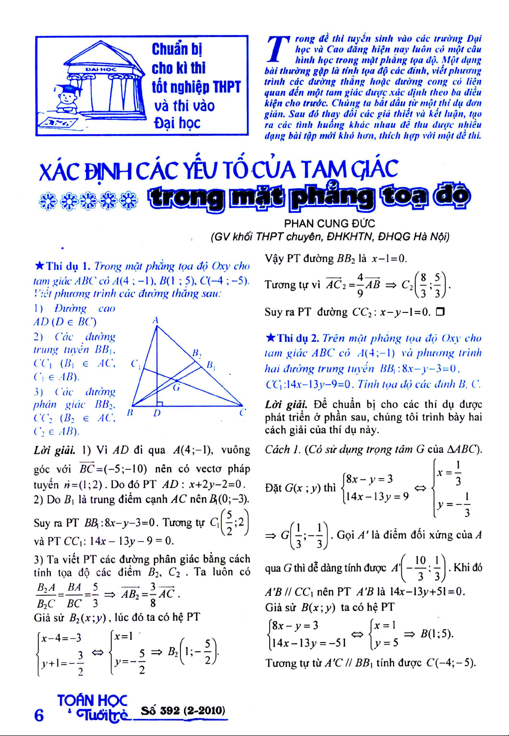 Trong đề thi tuyển sinh vào đại học và cao đẳng hiện nay luôn có một cầu về hình học trong mặt phẳng tọa độ. Một dạng bài thường gặp là tính tọa độ các đỉnh, viết phương trình các đường thẳng hoặc đường cong có liên quan đến một tam giác được xác định theo ba điều kiện cho trước. Tài liệu sau sẽ hướng dẫn các bạn chi tiết cách giải và ví dụ cụ thể.