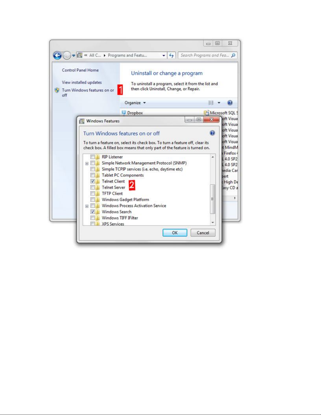 - Kích hoạt tính năng telnet của Windows (trong phần