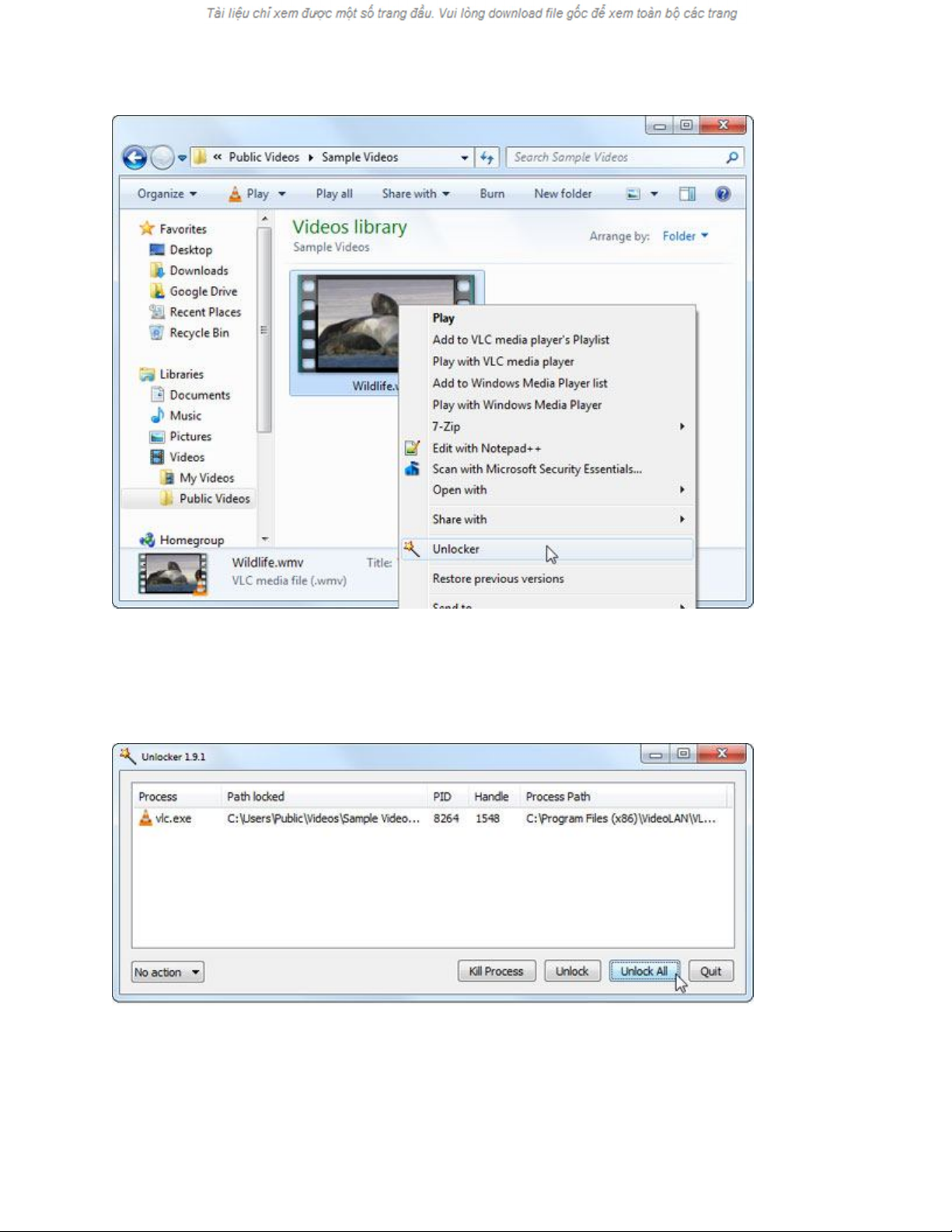 Lưu ý: Mở khóa các tập tin và xóa chúng có thể gây ra vấn đề cho chương trình đang