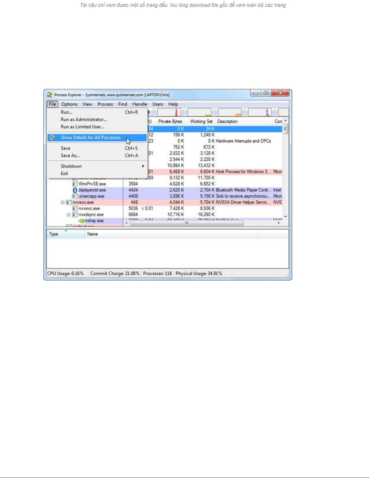 khởi chạyProcess Explorer > nhấn vào menu File > chọn Show Details for All